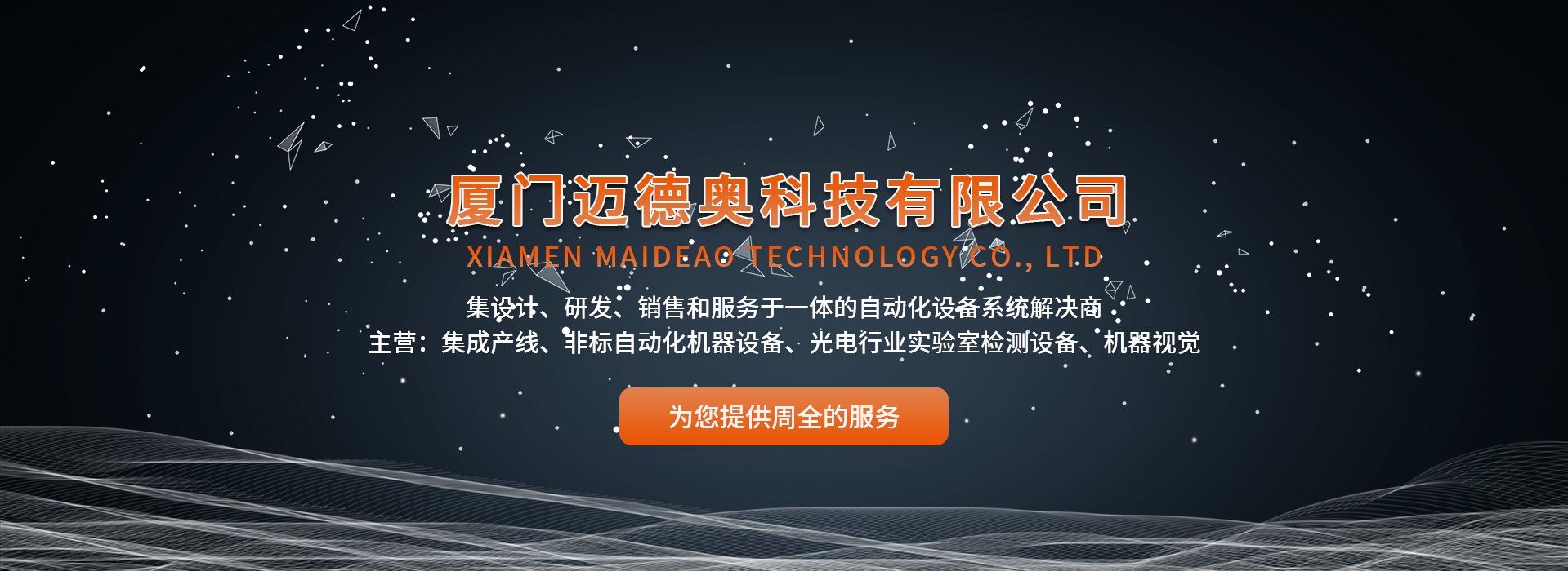 廈門邁德奧科技有限公司是?家集設計、研發、銷售和服務于?體的?動化設備系統解決商。在機器?領域和機器視覺及運動控制有著?常專業的?案和系統解決辦法;作為?家成?于2017年的?動化科技企業,我司著?于資源整合,?納英才,?程師都擁有機械結構、電?等較為豐富的?程項?經驗,義?反顧的加??業4.0的?環境,為改善?產質量提?效率做出我們的貢獻。公司采?扁平化、?性化的管理模式,崇尚創新與實踐相結合、精?細作、?臻的?匠精神,真誠地對待每?位客戶,始終站在客戶?度,努?塑造 ?個個精品?程。同時,在世界?業 4.0 ?潮中,我司期盼與社會各界精英精誠合作,協同發展,互利共贏,為我國?業?動化事業貢獻??的?量!